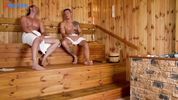 Милая девушка с огромными сиськами была трахнута и обкончана в сауне из двух хуёв сразу!
