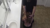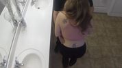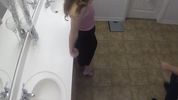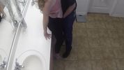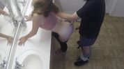 Белокожая блондинка с длинными волосами жарко ебется в общественном туалете с немолодым бородачом.